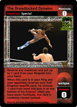 Reverse any maneuver and put up to 1 card from your Ringside into your hand. When this card is in your Ring and your opponent reverses your Kofi Kingston-specific card, he chooses 1 card from hand and puts it on the bottom of his Arsenal; when you have lower Fortitude, the card is randomly chosen instead.