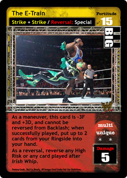 As a maneuver, this card is -3F and +3D, and cannot be reversed from Backlash; when successfully played, put up to 2 cards from your Ringside into your hand. As a reversal, reverse any High Risk or any card played after Irish Whip.