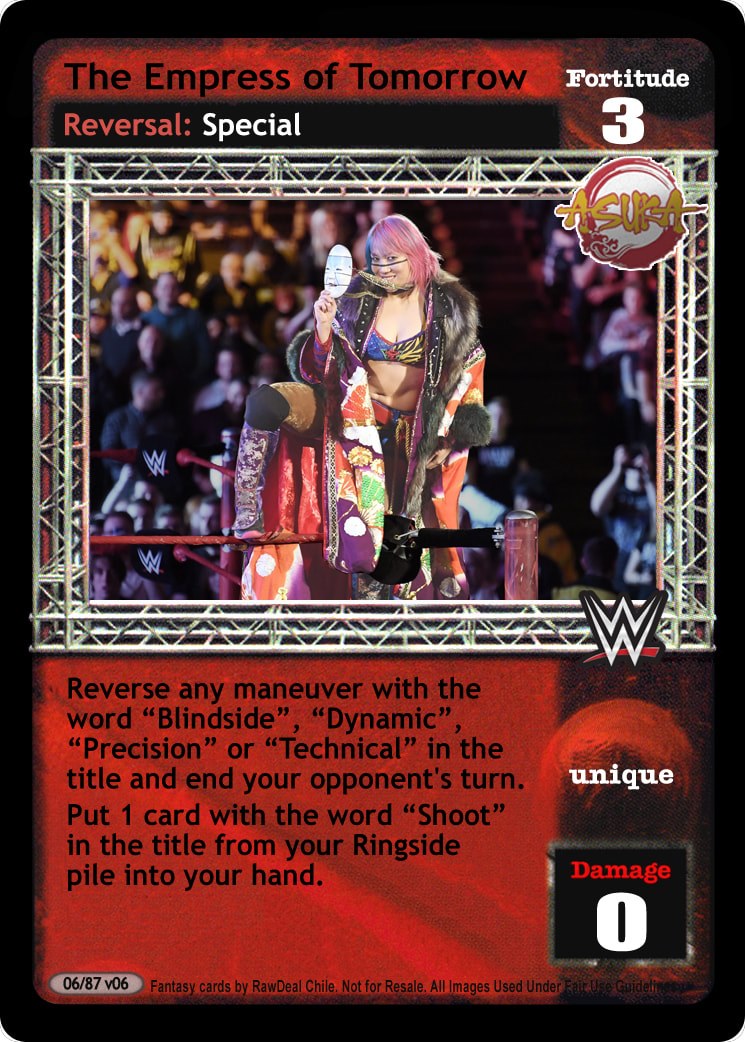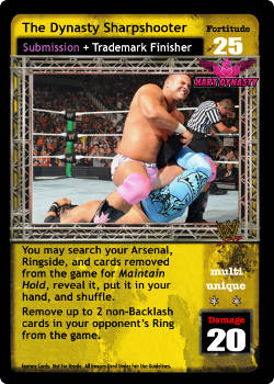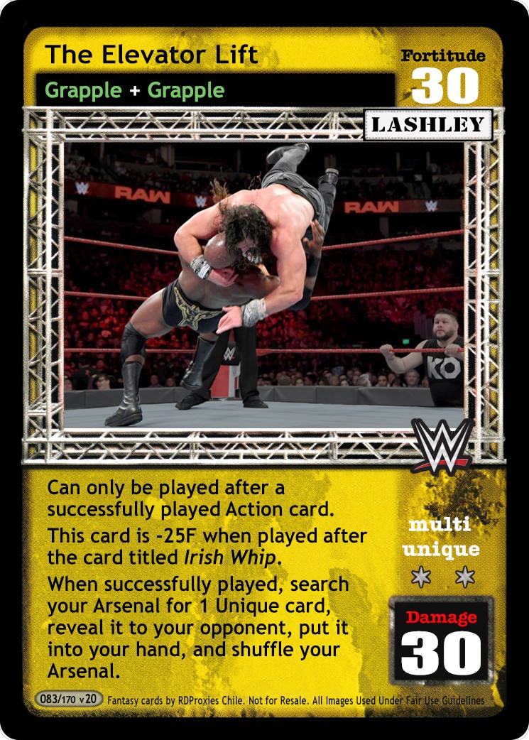 Can only be played after a successfully played Action card. This card is -25F when played after the card titled Irish Whip. When successfully played, search your Arsenal for 1 Unique card, reveal it to your opponent, put it into your hand, and shuffle your Arsenal.