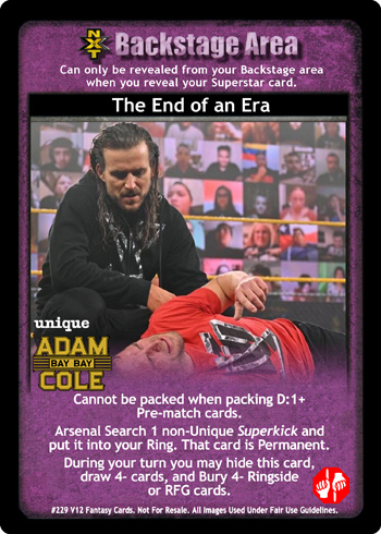 Cannot be packed when packing D:1+ Pre-match cards. Arsenal Search 1 non-Unique Superkick and put it into your Ring. That card is Permanent. During your turn you may hide this card, draw 4- cards, and Bury 4- Ringside or RFG cards.