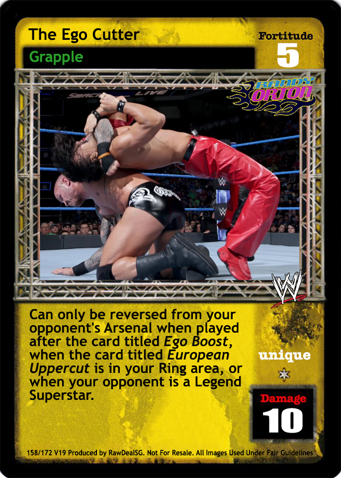 Can only be reversed from your opponent's Arsenal when played after the card titled Ego Boost, when the card titled European Uppercut is in your Ring area, or when your opponent is a Legend Superstar.