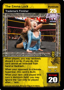 When played, you may randomly discard 4 cards; if you do, this card cannot be reversed from hand or Backlash. When your opponent is a female Superstar, this card is Multi. When your next card played this turn is Maintain Hold, you may ignore the 'Can only be played after...' text.