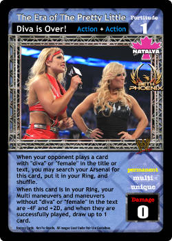 When your opponent plays a card with 'diva' or 'female' in the title or text, you may search your Arsenal for this card, put it in your Ring, and shuffle. When this card is in your Ring, your Multi maneuvers and maneuvers without 'diva' or 'female' in the text are -4F and +2D, and when they are successfully played, draw up to 1 card.