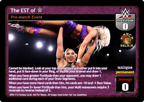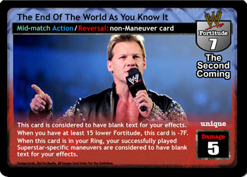 This card is considered to have blank text for your effects. When you have at least 15 lower Fortitude, this card is -7F. When this card is in your Ring, your successfully played Superstar-specific maneuvers are considered to have blank text for your effects.