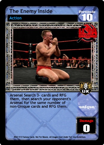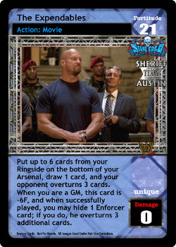 Put up to 6 cards from your Ringside on the bottom of your Arsenal, draw 1 card, and your opponent overturns 3 cards. When you are a GM, this card is -6F, and when successfully played, you may hide 1 Enforcer card; if you do, he overturns 3 additional cards.