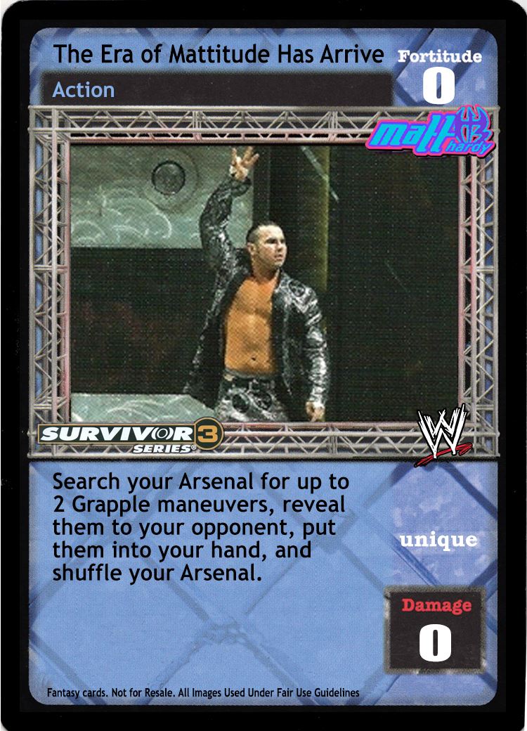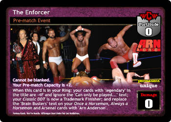 Cannot be blanked. Your Pre-match Capacity is +2. When this card is in your Ring: your cards with 'legendary' in the title are -4F and ignore the 'Can only be played...' text; your Classic DDT is now a Trademark Finisher; and replace the 'Brain Busters' text on your Once a Horseman, Always a Horseman and Arsenal cards with 'Arn Anderson'.
