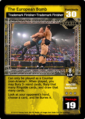 Can only be played as a Counter (non-Arsenal). When played, you may Bury 3- Hand cards, Bury that many Ringside cards, and draw that many cards. Look at your opponent's hand, choose a card, and he Buries it.