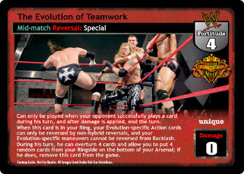 Can only be played when your opponent successfully plays a card during his turn, and after damage is applied, end the turn. When this card is in your Ring, your Evolution-specific Action cards can only be reversed by non-hybrid reversals, and your Evolution-specific maneuvers cannot be reversed from Backlash. During his turn, he can overturn 4 cards and allow you to put 4 random cards from your Ringside on the bottom of your Arsenal; if he does, remove this card from the game.