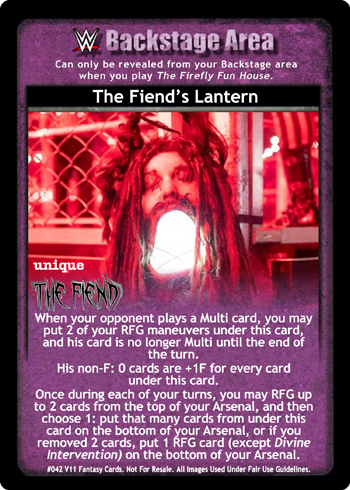 When you are Bray Wyatt, your Starting Hand Size is +3. When you RFG a Superstar-specific card for your Ability, you may put that card on the bottom of your Arsenal instead (when you are The Fiend, into your hand instead). Your opponent must overturn 2 cards to play a card with the same title as a card in your Ring.