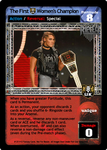 When you have greater Fortitude, this card is Permanent. As an action, your opponent discards 2 cards and you shuffle 6- Ringside cards into your Arsenal. As a reversal, reverse any non-maneuver card or ACE and he discards 1 card. When overturned, -8F and can also reverse a non-damage card effect (even during the Pre-match phase).