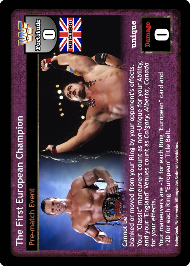 Cannot be blanked or moved from your Ring by your opponent's effects. Your maneuvers with 'classic' in the title are considered non-Unique for your Ability. Your maneuvers are -1F for each card with 'European' in the title in your Ring; when WWF European Title Belt is in your Ring, your maneuvers are +2D.