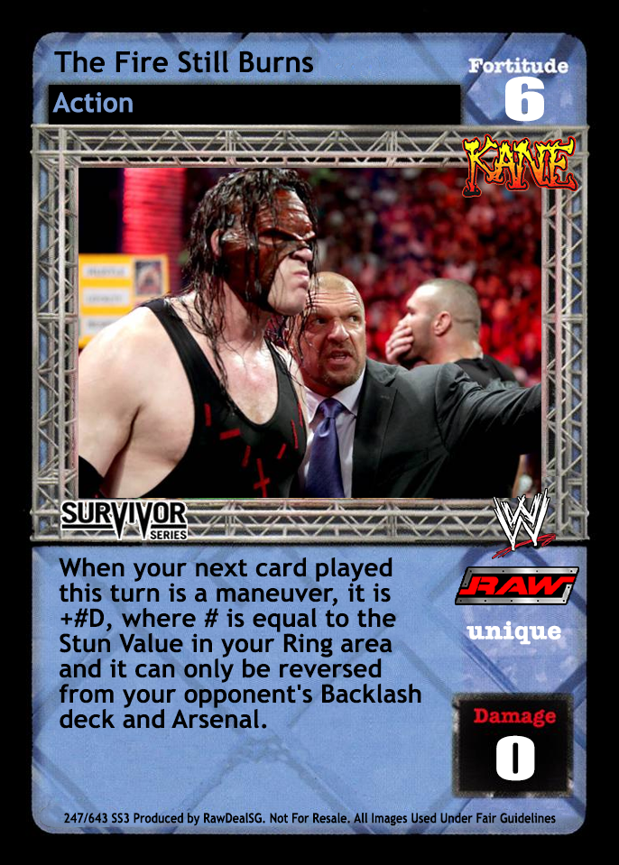 If your next card played this turn is a Maneuver card, it is +#D, where # is equal to the Stun Value in your Ring area and it can only be reversed from your opponent's Backlash deck and Arsenal.