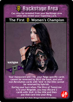 Your maneuvers are +1D, your Paige-specific cards cannot be reversed by Skirt the Issue, and your non-Revolution cards with 'kick' in the title cannot be reversed by hybrids. During your turn when The Diva of Tomorrow is in your Ringside, you may discard 2 cards with 'kick' in the title and then put that card into your Ring.