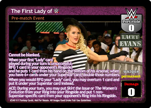 Cannot be blanked. When your first 'Lady' card played during your turn is unsuccessful, RFG 1 card in your opponent's Ringside, and he puts 1 card from his hand on the bottom of his Arsenal; when you have 6+ cards under your Superstar card, double those numbers. When you would RFG your 'Lady' card, you may overturn 1 card and put it under your Superstar card instead. ACE: During your turn, you may put Skirt the Issue or The Women's Evolution from your Ring into your Ringside and put 1 non-Superstar-specific card from your opponent's Ring into his Ringside.