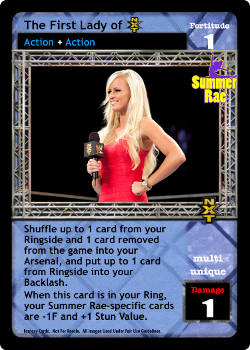Shuffle up to 1 card from your Ringside and 1 card removed from the game into your Arsenal, and put up to 1 card from Ringside into your Backlash. When this card is in your Ring, your Summer Rae-specific cards are -1F and +1 Stun Value.