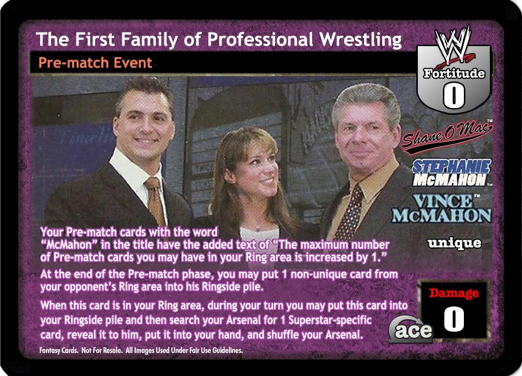 Your Pre-match cards with the word "McMahon" in the title have the added text of "The maximum number of Pre-match cards you may have in your Ring area is increased by 1." At the end of the Pre-match phase, you may put 1 non-unique card from your opponent's Ring area into his Ringside pile. When this card is in your Ring area, during your turn you may put this card into your Ringside pile and then search your Arsenal for 1 Superstar-specific card, reveal it to him, put it into your hand, and shuffle your Arsenal.