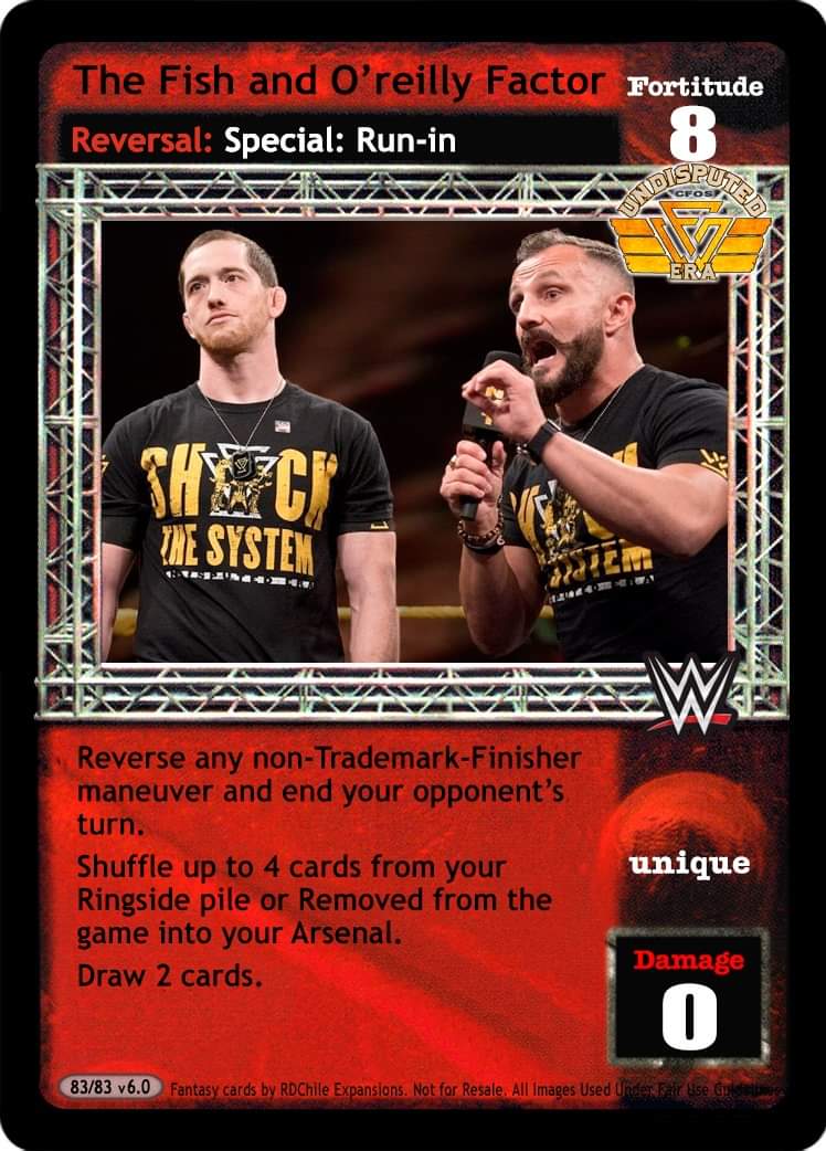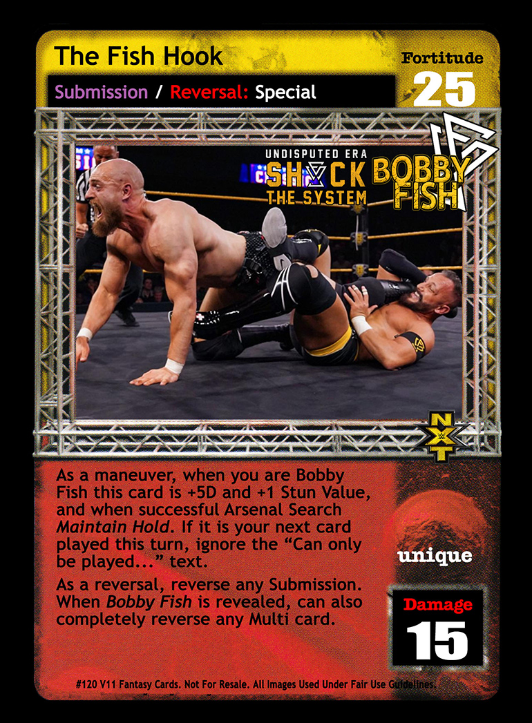 As a maneuver, when you are Bobby Fish this card is +5D and +1 Stun Value, and when successful Arsenal Search Maintain Hold. If it is your next card played this turn, ignore the “Can only be played...” text. As a reversal, reverse any Submission. When Bobby Fish is revealed, can also completely reverse any Multi card.