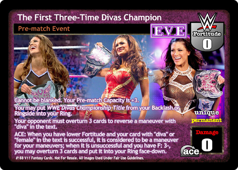 Cannot be blanked. Your Pre-match Capacity is +3. You may put WWE Divas Championship Title from your Backlash or Ringside into your Ring. Your opponent must overturn 3 cards to reverse a maneuver with 'diva' in the text. ACE: When you have lower Fortitude and your card with 'diva' or 'female' in the text is successful, it is considered to be a maneuver for your maneuvers; when it is unsuccessful and you have F: 3-, you may overturn 3 cards and put it into your Ring face-down.