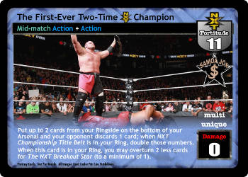 Put up to 2 cards from your Ringside on the bottom of your Arsenal and your opponent discards 1 card. When NXT Championship Title Belt is in your Ring, double those numbers. When this card is in your Ring, you may overturn 2 less cards for The NXT Breakout Star (to a minimum of 1).