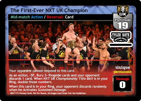 Your opponent cannot respond to this card. As an action, -5F, Bury 2- Ringside cards and your opponent discards 1 card. When NXT UK Championship Title Belt is in your Ring, double those numbers. When this card is in your Ring, your opponent discards randomly when he Activates Sustained Damage.