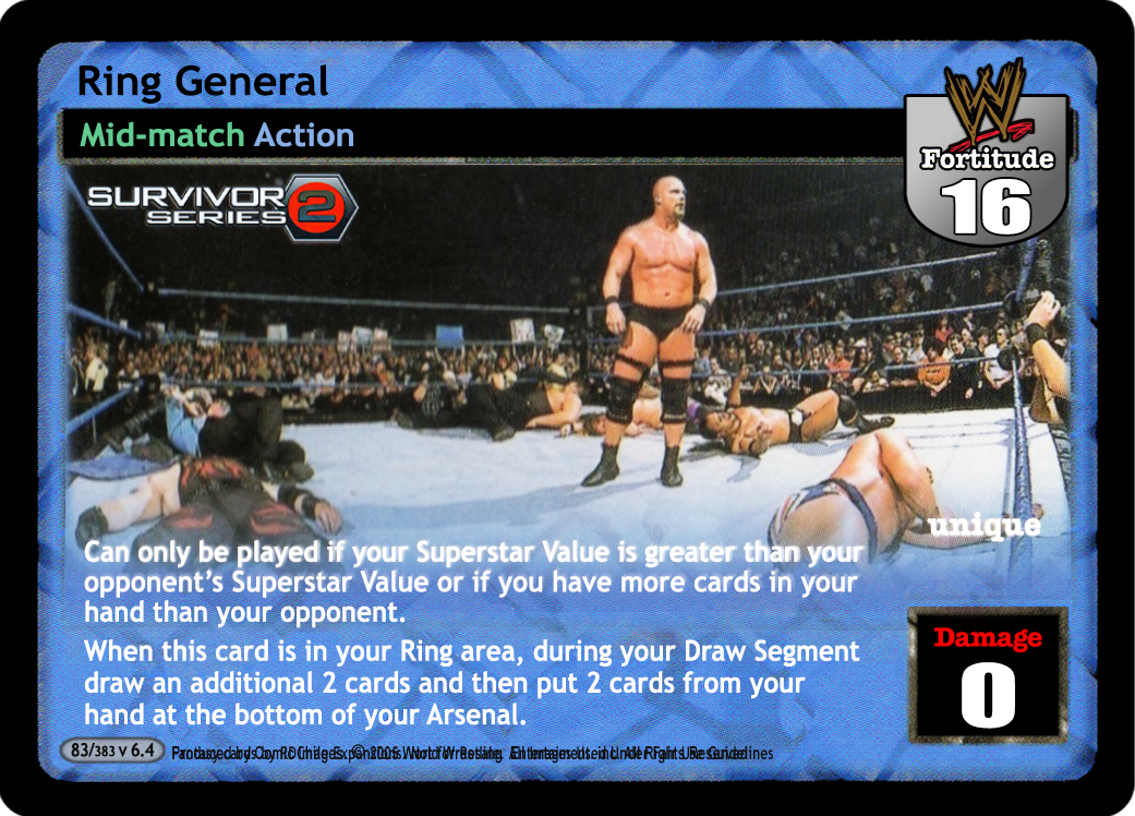 Reverse any non-Trademark-Finisher maneuver and end your opponent`s turn. Shuffle up to 4 cards from your ringside pile or removed form the game into your arsenal. Draw 2 cards