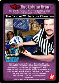 Search your Arsenal for up to 2 Foreign Objects, reveal them, put them under Wrestling in Sports Equipment, and shuffle; your opponent's non-F: 0 reversals to a Foreign Object played from under that card are +#F, where # is the Fortitude of your card. You may hide this card to blank the text and damage of his successfully played maneuver.