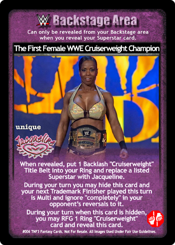 When revealed, put 1 Backlash 'Cruiserweight' Title Belt into your Ring and replace a listed Superstar with Jacqueline. During your turn you may hide this card and your next Trademark Finisher played this turn is Multi and ignore 'completely' in your opponent’s reversals to it. During your turn when this card is hidden, you may RFG 1 Ring 'Cruiserweight' card and reveal this card.