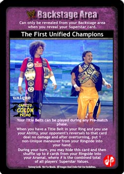 Your Title Belts can be played during any Pre-match phase. When you have a Title Belt card in your Ring and you use your Ability, your opponent's reversals to that card deal no damage and after overturning, put 1 non-Unique maneuver from your Ringside into your hand. During your turn, you may hide this card and then shuffle up to # cards from your Ringside into your Arsenal, where # is the combined total of all players' Superstar Values.