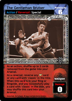 As an action, shuffle up to 2 cards removed from the game into your Arsenal. As a reversal, reverse any Classic WWF card or any card with 'classic' in the title. When this card is in your Ring or Ringside, and you successfully play a card with 'classic' in the title, you may shuffle this card into your Arsenal.