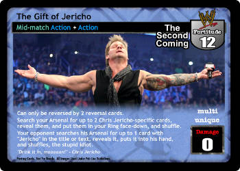 Can only be reversed by 2 reversal cards. Search your Arsenal for up to 2 Chris Jericho-specific cards, reveal them, and put them in your Ring face-down, and shuffle. Your opponent searches his Arsenal for up to 1 card with 'Jericho' in the text, reveals it, puts it into his hand, and shuffles, the stupid idiot.