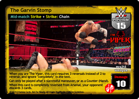 When you are The Viper, this card requires 3 reversals instead of 2 to reverse, and ignore 'completely' in their text. Can only be played after a successful maneuver, or as a Counter (hand). When this card is completely reversed from Arsenal, your opponent discards 3 cards.