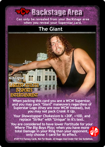 When packing this card you are a WCW Superstar, and you may pack 'Giant' maneuvers regardless of Superstar Logo (they are now WCW instead), but you may not pack Crank it Up. Your Showstopper Chokeslam is +20F, +10D, and replace 'Strike' with 'Unique' in its text. You are considered to have lower Fortitude for your Where The Big Boys Play; when you have more total Damage in your Ring than your opponent, only choose 1 card for its effect.