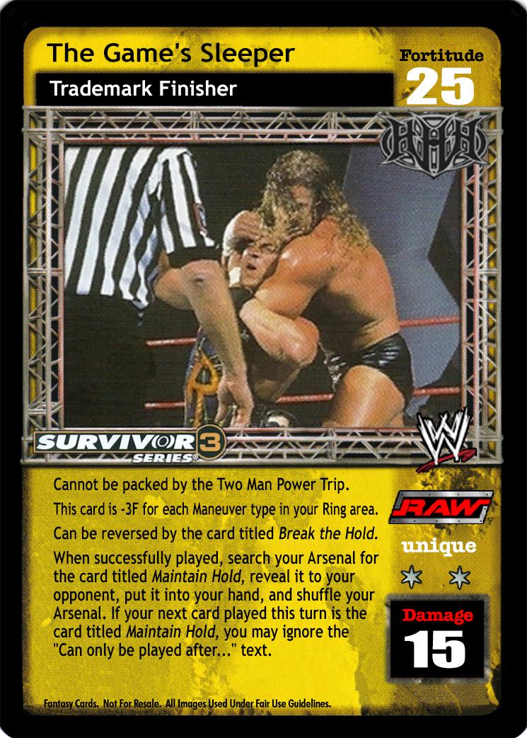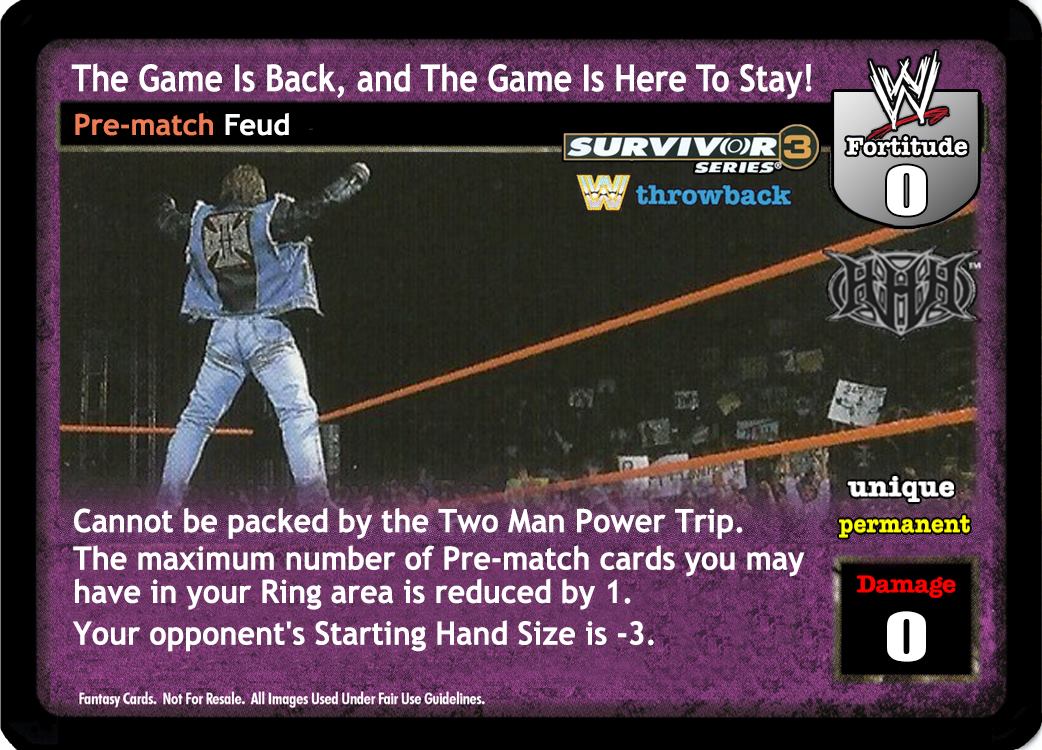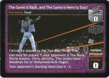 Cannot be played by the Two Man Power Trip. Can only be played if your opponent is The Rock, Steve Austin, Chris Jericho, The Undertaker / Deadman Inc, or Hollywood Hulk Hogan. Your opponent's Starting Hand Size is -3.