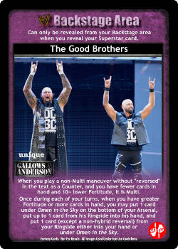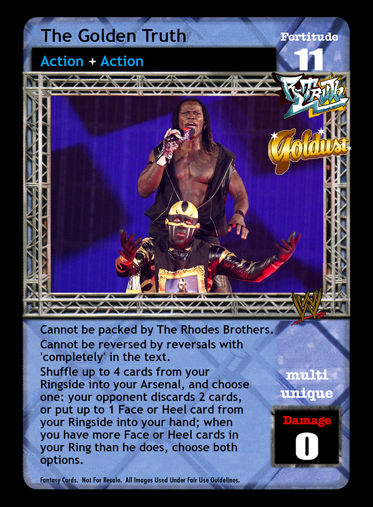 Cannot be packed by The Rhodes Brothers. Cannot be reversed by reversals with 'completely' in the text. Shuffle up to 4 cards from your Ringside into your Arsenal, and choose one: your opponent discards 2 cards, or put up to 1 Face or Heel card from your Ringside into your hand; when you have more Face or Heel cards in your Ring than he does, choose both options.
