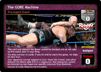 This card and Unleash the Beast cannot be blanked and do not take up Pre-match slots in your Ring. You may overturn 6 cards; if you do and he starts the game, he skips his first turn. Your opponent cannot respond to your Taunt the Crowd, and when Unleash the Beast adds 5+D to a maneuver, that maneuver cannot be reversed by non-Superstar-specific reversals from Backlash.