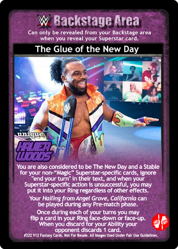 You are also considered to be The New Day and a Stable for your non-'Magic' Superstar-specific cards, ignore 'end your turn' in their text, and when your Superstar-specific action is unsuccessful, you may put it into your Ring regardless of other effects. Your Hailing from Angel Grove, California can be played during any Pre-match phase. Once during each of your turns, you may flip a card in your Ring Face-down or Face-up. When you discard for your Ability your opponent discards 1 card.