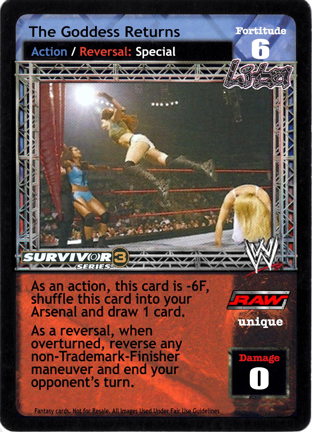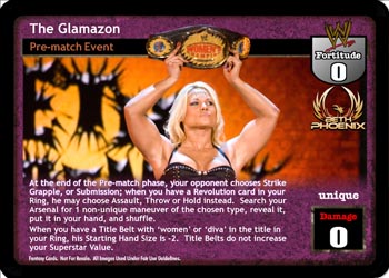 At the end of the Pre-match phase, your opponent chooses Strike, Grapple, or Submission; when you have a Revolution card in your Ring, he may choose Assault, Throw or Hold instead. Search your Arsenal for 1 non-unique maneuver of the chosen type, reveal it, put it in your hand, and shuffle. When you have a Title Belt with 'women' or 'diva' in the title in your Ring, his Starting Hand Size is -2. Title Belts do not increase your Superstar Value.