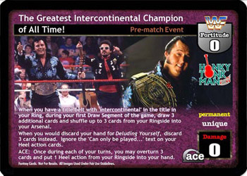 When you have a title belt with 'intercontinental' in the title in your Ring, during your first Draw Segment of the game, draw 3 additional cards and shuffle up to 3 cards from your Ringside into your Arsenal. When you would discard your hand for Deluding Yourself, discard 3 cards instead. Ignore the 'Can only be played...' text on your Heel action cards. ACE: Once during each of your turns, you may overturn 3 cards and put 1 Heel action from your Ringside into your hand.