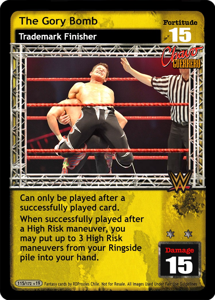 Can only be played after a successfully played card. When successfully played after a High Risk maneuver, you may put up to 3 High Risk maneuvers from your Ringside pile into your hand.