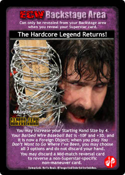 You may increase your Starting Hand Size by 4. Your Barbed Wire Baseball Bat is -10F and +3D, and it is now a Foreign Object; when you play You Don't Want to Go Where I've Been, you may choose all 3 options and do not discard your hand. You may discard a Mid-match reversal card to reverse a non-Superstar specific non-maneuver card.