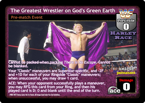 Cannot be packed when packing There Is No Escape. Cannot be blanked. Your 'Classic' maneuvers are Superstar-specific, and -2F and +1D for each of your Ringside 'Classic' maneuvers; when unsuccessful, you may draw 1 card. ACE: When your opponent successfully plays a maneuver, you may RFG this card from your Ring, and then his played card is D: 0 and blank until the end of the turn.
