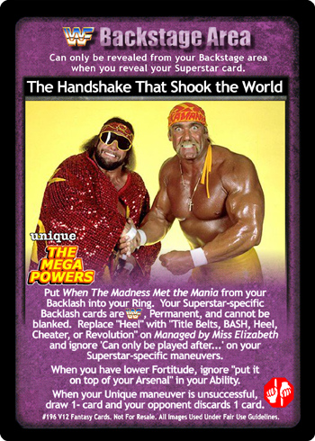 Put When The Madness Met the Mania from your Backlash into your Ring. Your Superstar-specific Backlash cards are [Classic WWF logo], Permanent, and cannot be blanked. Replace 'Heel' with 'Title Belts, BASH, Heel, Cheater, or Revolution' on Managed by Miss Elizabeth and ignore 'Can only be played after...' on your Superstar-specific maneuvers. When you have lower Fortitude, ignore 'put it on top of your Arsenal' in your Ability. When your Unique maneuver is unsuccessful, draw 1- card and your opponent discards 1 card.
