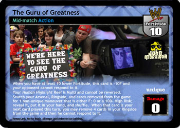 When you have at least 10 lower Fortitude, this card is -10F and your opponent cannot respond to it. Your Human Highlight Reel is Multi and cannot be reversed. Search your Arsenal, Ringside, and cards removed from the game for 1 non-unique maneuver that is either F: 0 or a 10D- High Risk, reveal it, put it in your hand, and shuffle. When that card is your next card played this turn, you may remove 4 cards in your Ringside from the game and then he cannot respond to it.