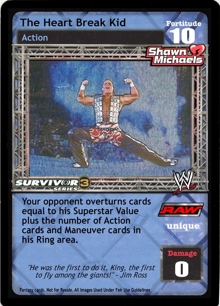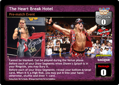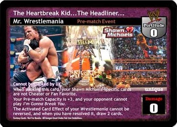 Cannot be packed by DX. When packing this card, your Shawn Michaels-specific cards are not Cheater or Fan Favorite. Your Pre-match Capacity is +3, and your opponent cannot play I'm Gonna Break You. The Activated Card Effect of your Wrestlemania cannot be reversed, and when you have resolved it, draw 2 cards.