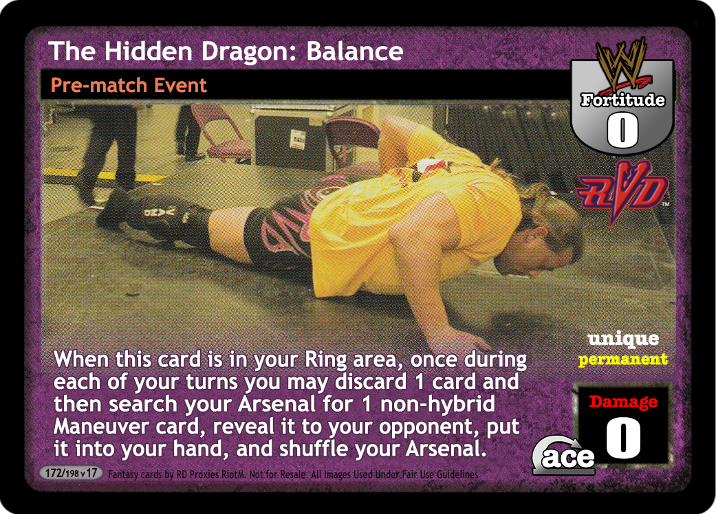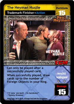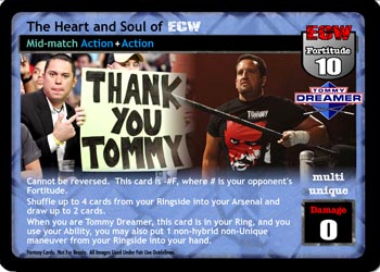 Cannot be reversed. This card is -#F, where # is your opponent's Fortitude. Shuffle up to 4 cards from your Ringside into your Arsenal and draw up to 2 cards. When you are Tommy Dreamer, this card is in your Ring, and you use your Ability, you may also put 1 non-hybrid non-Unique maneuver from your Ringside into your hand.