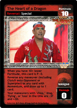 When you have 10+ lower Fortitude, this card is F: 0. Reverse any maneuver (including Clutch Onto Opponent or Superplex) or any card with Momentum, and draw up to 1 card. Your maneuvers with 'chop,' 'drag,' 'flying', or 'toss' in the title are -3F and +3D.