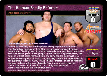Can only be packed by Andre the Giant. Cannot be blanked, and can be played during any Pre-match phase. Your Backstage cards cannot be blanked, and your opponent cannot reduce your Starting Hand Size, or move cards from your hand before the first turn of the game. When you play your Superstar-specific cards, the number of Heat cards removed from the game for the Heat trait is 0. ACE: Once during each of your turns, you may choose 1 maneuver that is not Superstar-specific, Multi, or RMS in your Ringside, and then randomly remove 1 other card in your Ringside from the game and play the chosen maneuver as if from hand, but he ignores any reversal restrictions on that card (including Chain).