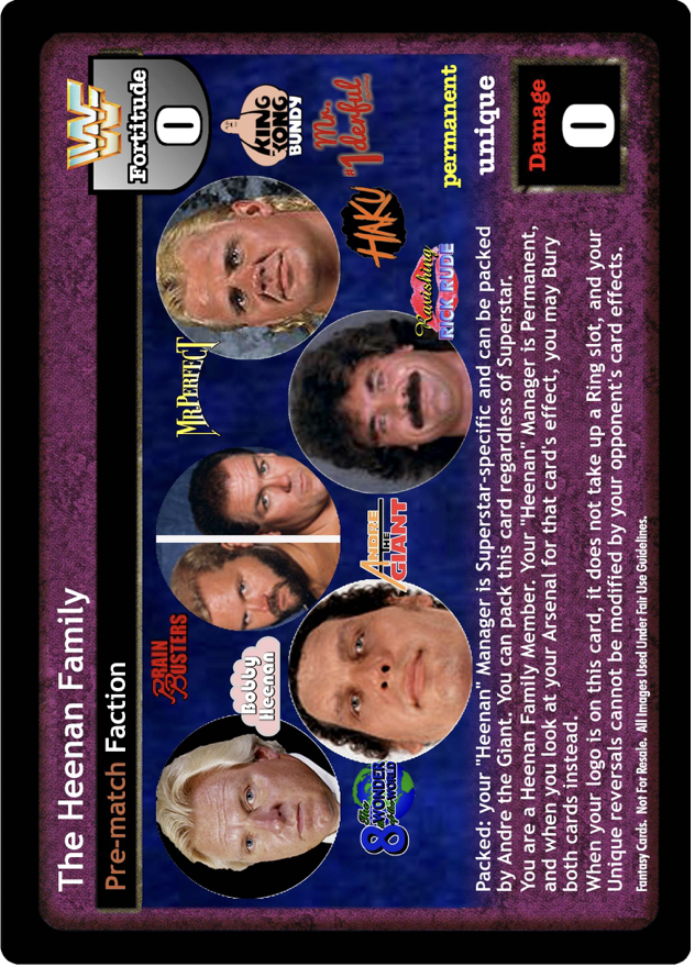 You can pack this card regardless of Superstar. You are now a Heenan Family Member. Your Managed by Bobby 'The Brain' Heenan is Permanent, and when looking at your Arsenal with that card, you may put both cards on the bottom of your Arsenal instead. When your logo is printed on this card, or you have another card with 'Heenan Family' in the text in your Ring, your Unique reversals are not affected by your opponent's card effects.