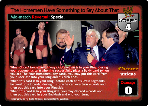 When Once A Horseman, Always A Horseman is in your Ring, during your opponent's turn when he successfully plays a D: 4+ card (when you are The Four Horsemen, any card), you may put this card from your Backlash into your Ring and his turn ends. When this card is in your Ring, before each of his Draw Segments, he overturns 2 cards; during his turn he can overturn 4 cards and then put this card into your Ringside. When this card is in your Ringside, you may discard 4 cards and then put this card in your Backlash and end your turn.
