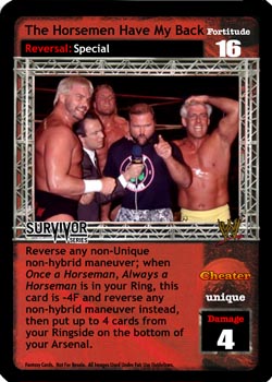 Reverse any non-Unique non-hybrid maneuver; when Once a Horseman, Always a Horseman is in your Ring, this card is -4F and reverse any non-hybrid maneuver instead, then put up to 4 cards from your Ringside on the bottom of your Arsenal.